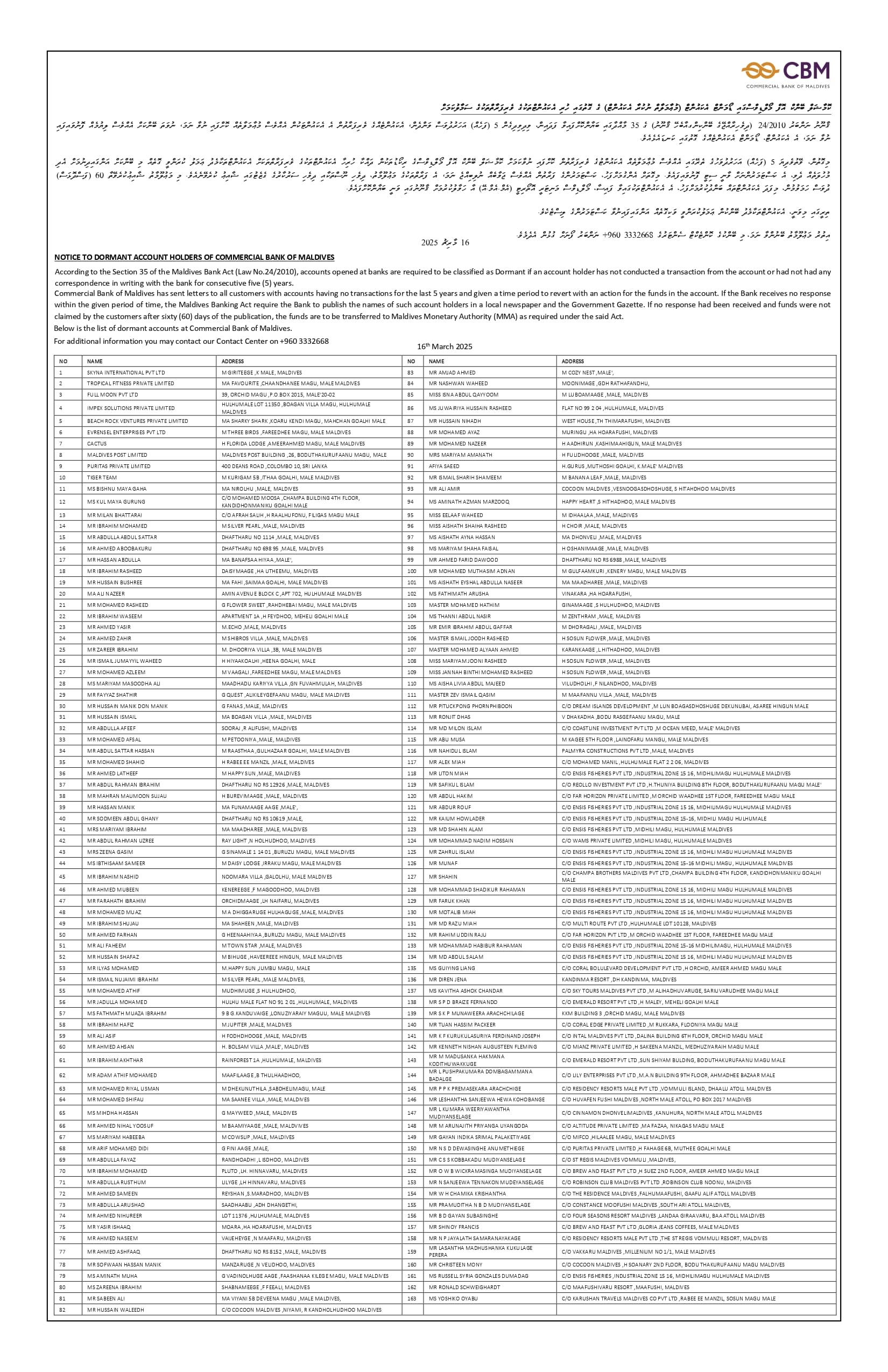 Notice to Dormant Account Holders of Commercial Bank of Maldives